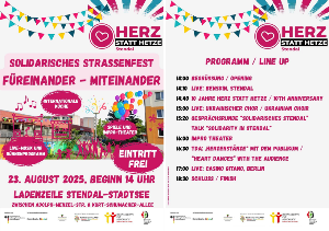 - Sa, 23.8., 14:00 Uhr, Ladenzeile Stendal Stadtsee: Solidarisches Straßenfest „Füreinander – Miteinander“