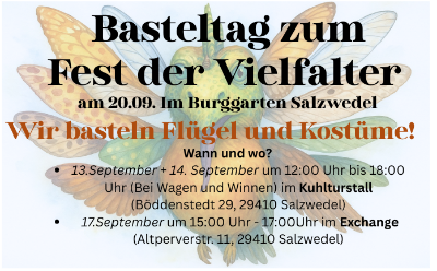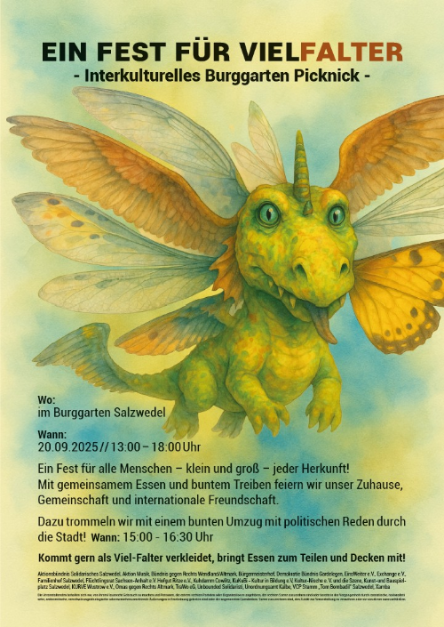 Am 20.9. lädt das Aktionsbündnis Solidarisches Salzwedel, unterstützt vom Bürgermeisterhof, der Kulturnische, dem Familienhof und vielen weiteren, zum interkulturellen Picknick im Burggarten. Von 13 bis 18 Uhr feiern wir das „Fest für Vielfalter“ für alle Menschen – groß und klein und jeder Herkunft – mit gemeinsamen Essen, buntem Treiben und Umzug durch die Stadt. Kommt gerne als Viel-Falter verkleidet (es wird vorher mehrere Kostümbasteltage geben!), bringt Essen, Geschirr und Decken mit!