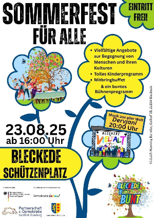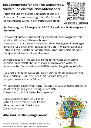 - Sa, 23.8., 16:00 Uhr, Schützenplatz Bleckede: Sommerfest für Alle organisiert von Bleckede bleibt bunt