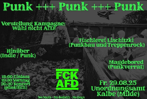 - Fr, 29.8., 19:00 Uhr, Unordnungsamt Kalbe: Vorstellung der Kampagne „Wählt nicht AfD!“ und Punkkonzerte