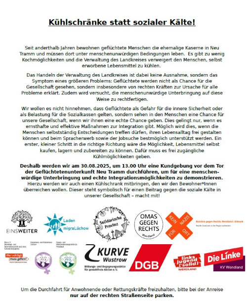 Sa, 30.8., 13:00 Uhr, Geflüchteten-Unterkunft Neu Tramm: Kühlschränke statt sozialer Kälte