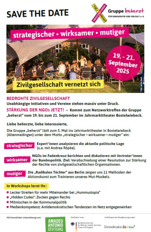 seit heute könnt Ihr Euch zu unserem 5. beherzt-Netzwerktreffen unter dem Motto „STRATEGISCHER . WIRKSAMER. MUTIGER“ vom 19. bis 21. September im Jahrmarkttheater in Bostelwiebeck (Altenmedingen) anmelden. Zum Programm und zur Anmeldung geht es hier: